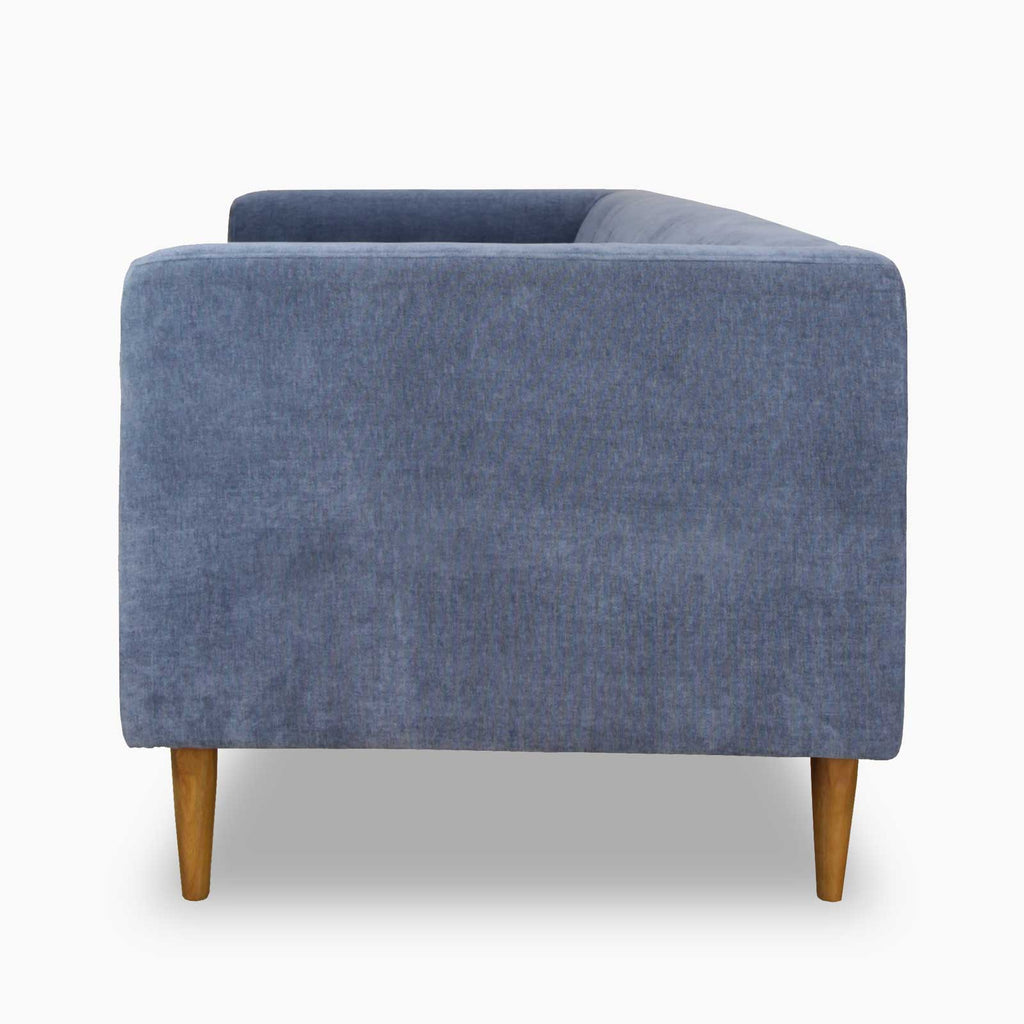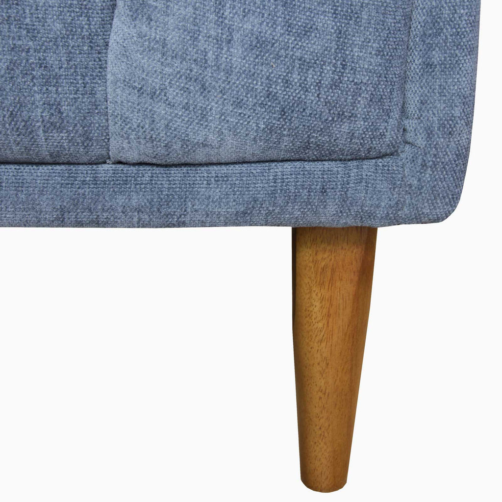 A tight seat and back keep its silhouette clean and modern, while inside-button tufting adds heritage character to its sculpted arms and back. Upholstered by hand in rich denim blue fabric, it features self-welt edges and a fully enclosed frame, finished with solid walnut-toned legs. Spring coil cushioning wrapped in high-density foam creates resilient comfort that keeps its shape and structure over time.