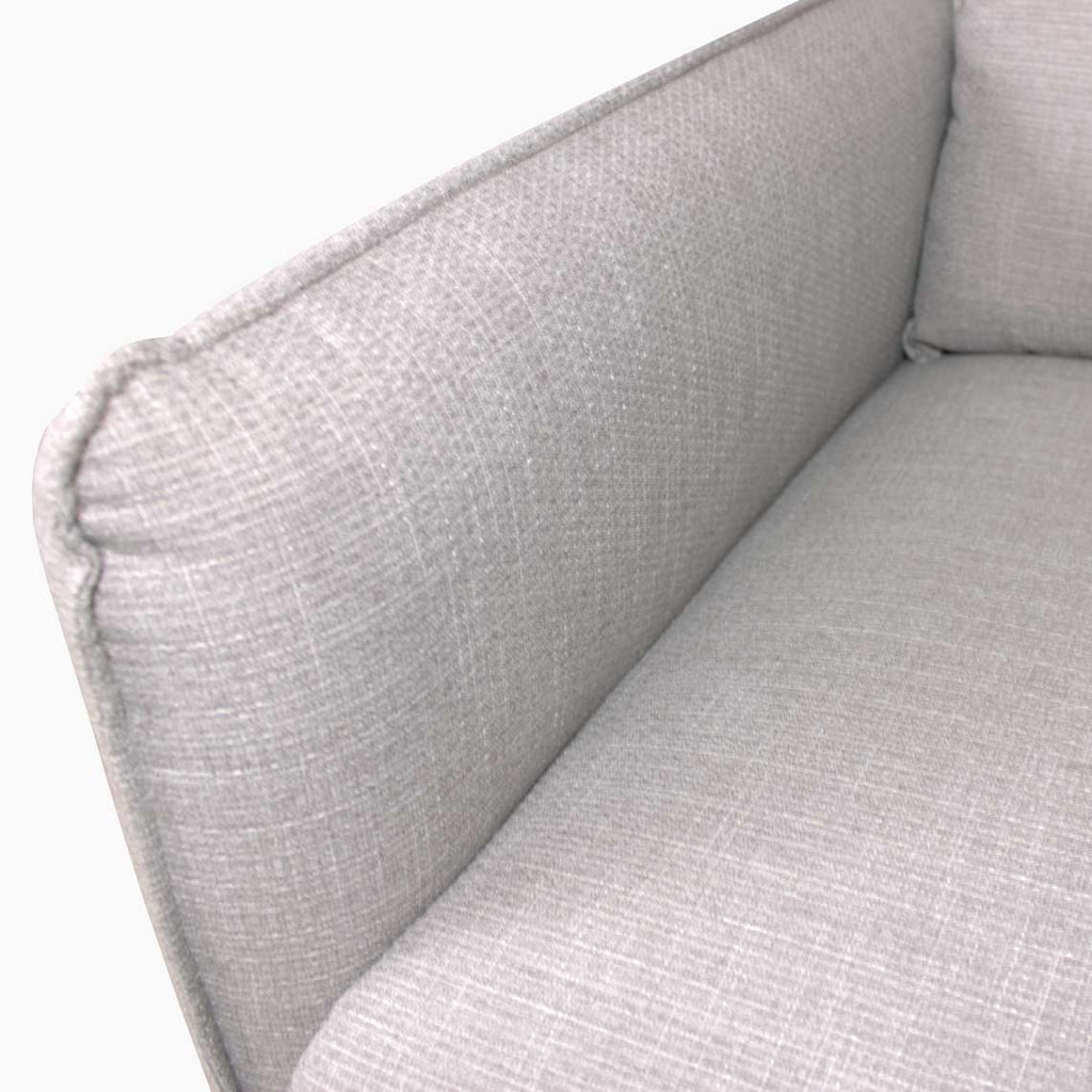 The Waverly’s signature loose-cushion silhouette invites a relaxed lounge feel, while its channeled fiber-filled back cushions and spring coil seat deliver resilient comfort that doesn’t lose shape. Hand-upholstered in Larkin Dove — a warm oatmeal-inspired neutral — it fits seamlessly into modern, transitional, or coastal-inspired homes.